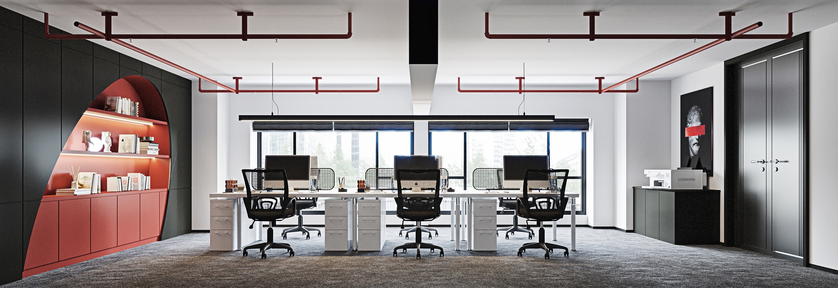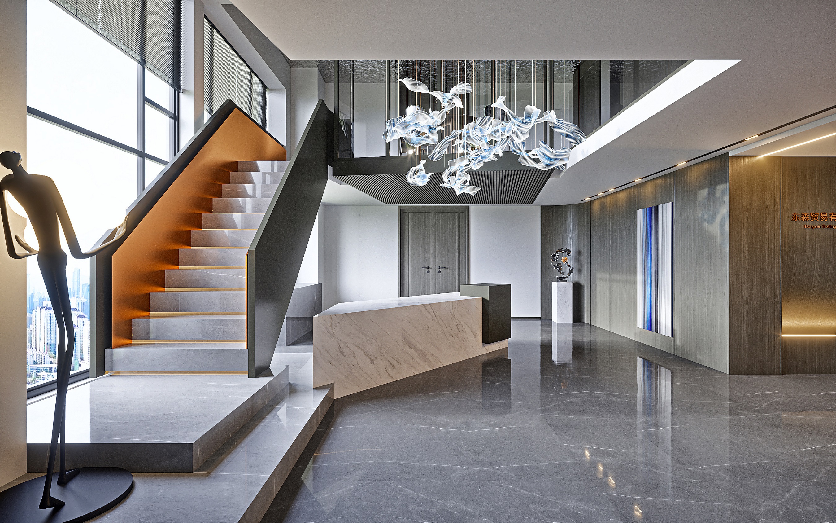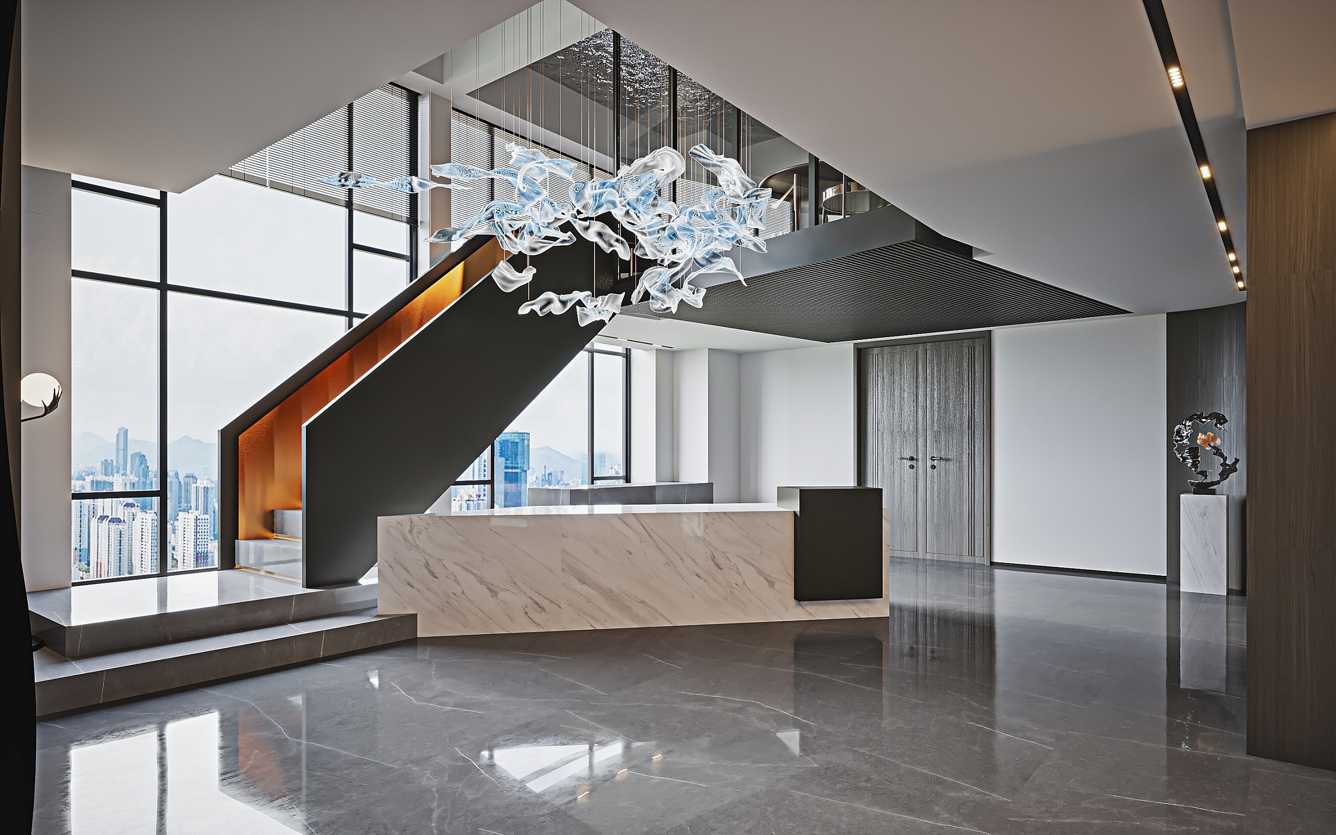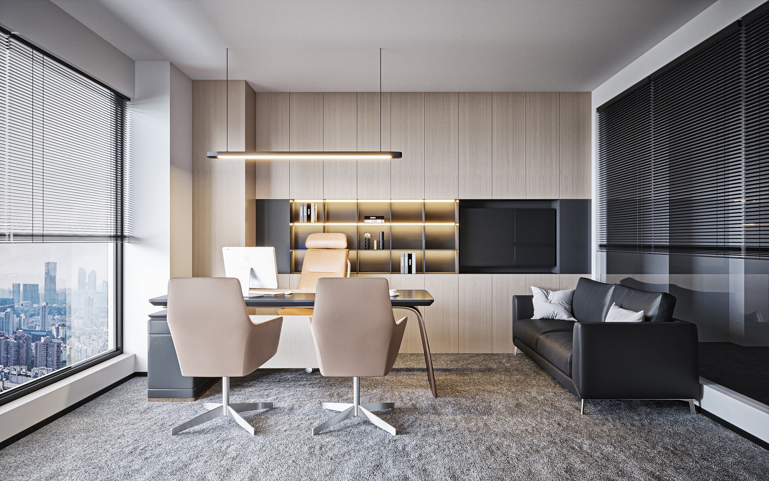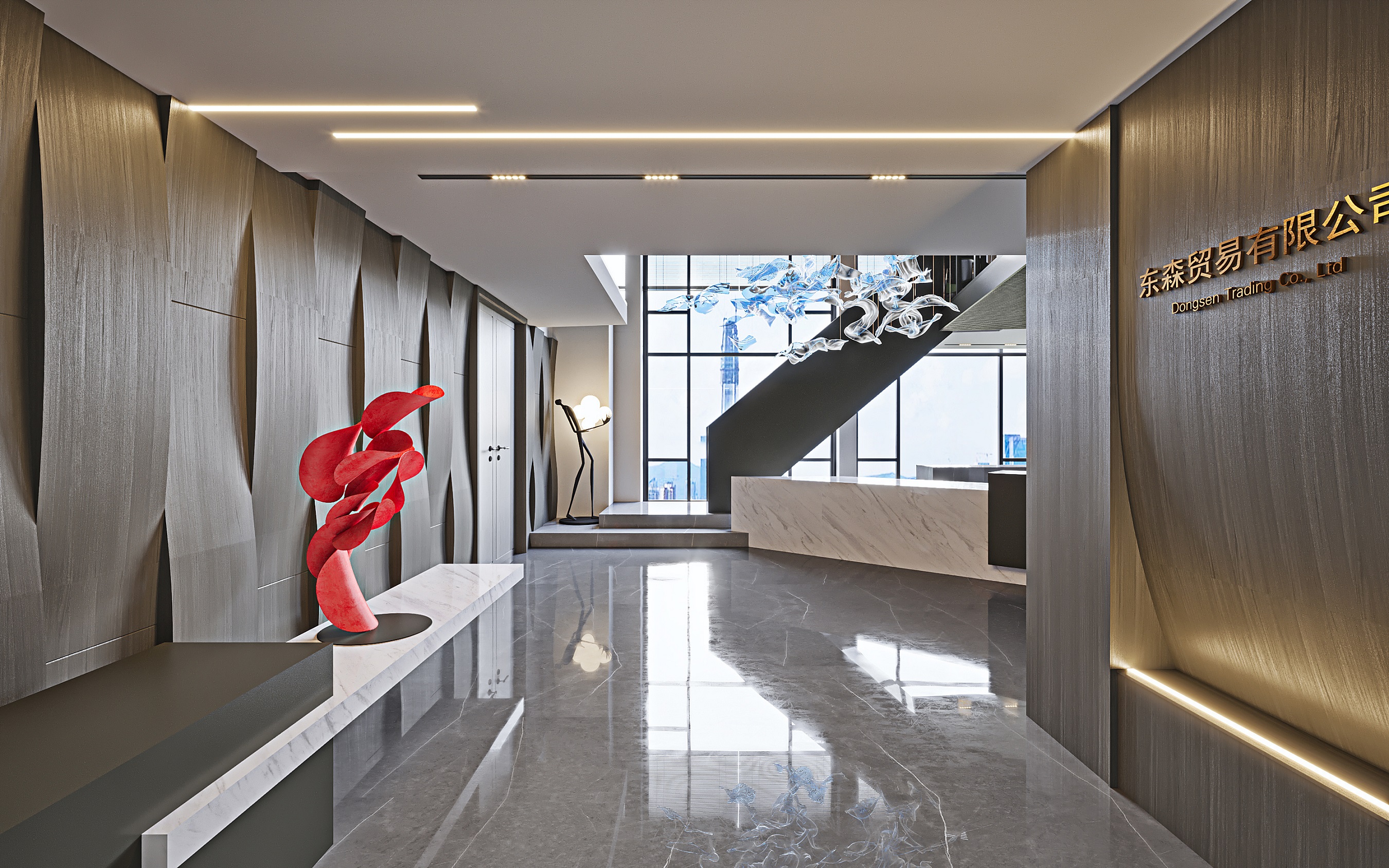 案例說明:本案設(shè)計為突顯建筑開間較舒適之優(yōu)點,設(shè)計師特意設(shè)計了過道各柱體間鑲嵌不銹鋼條及玻璃幕墻上的磨砂條來點綴的裝修主題,同時,地面用拼花色帶打破,與方正而美觀的吊頂上下呼應(yīng);辦公室靠近走道的墻面,為將自然光透入走道,同時又加強其“靈透”感,采用清玻幕墻,幕墻上的磨砂條既打破了玻璃墻面的呆板,又提醒了行人幕墻的存在,防止無意識碰頭、沖撞等類似意外發(fā)生;為辦公室的后續(xù)私密性考慮,其清玻幕墻內(nèi)掛以百葉窗遮擋既可。