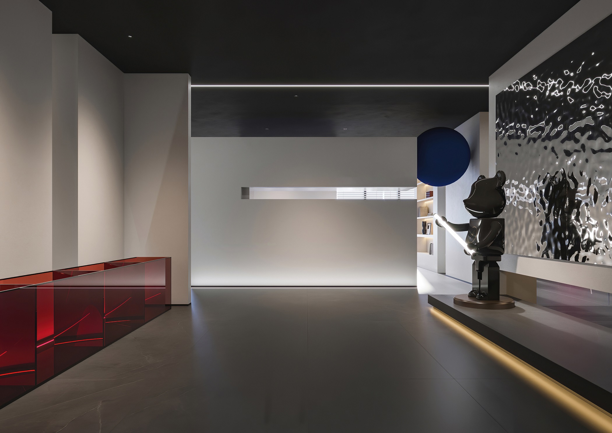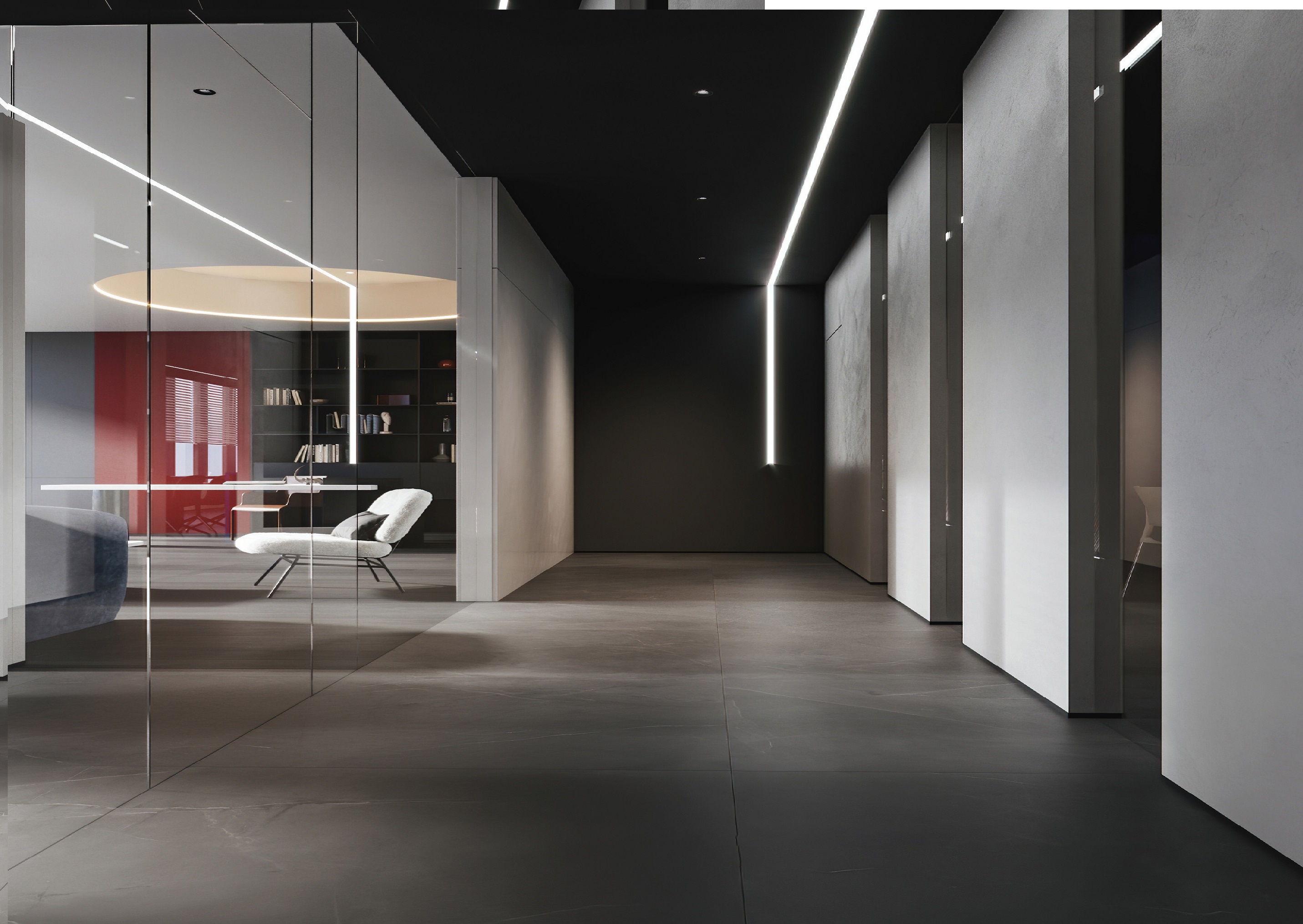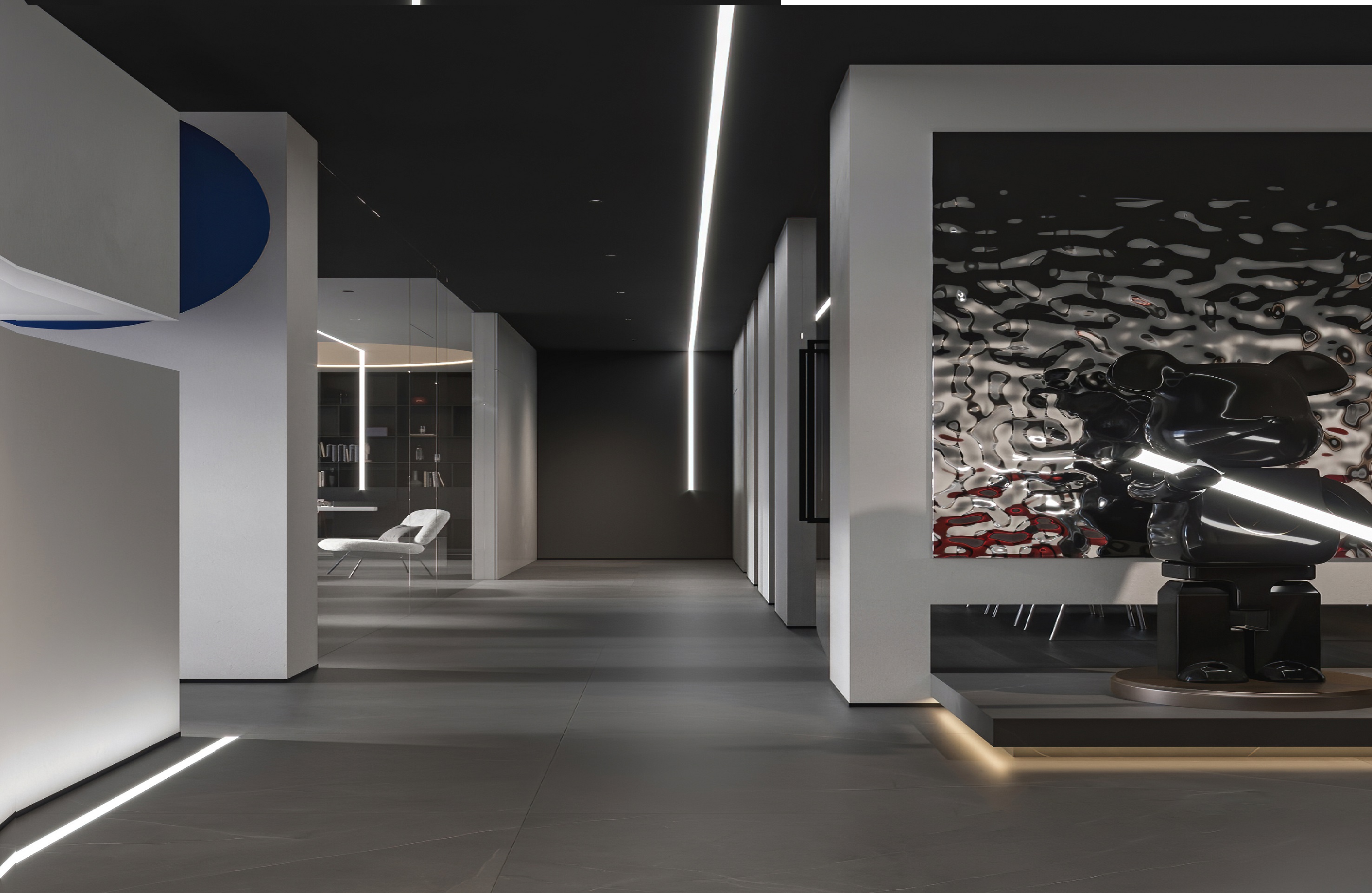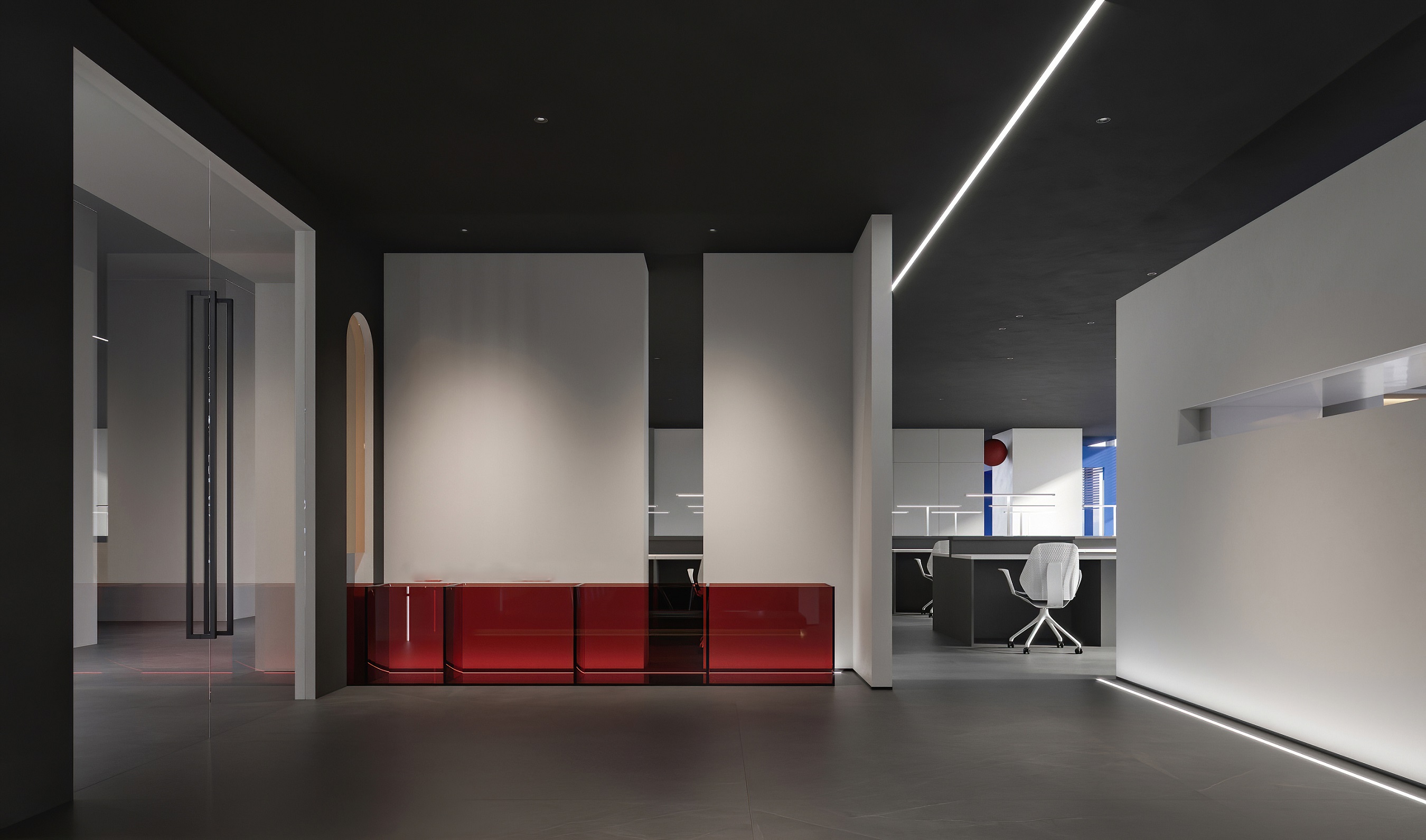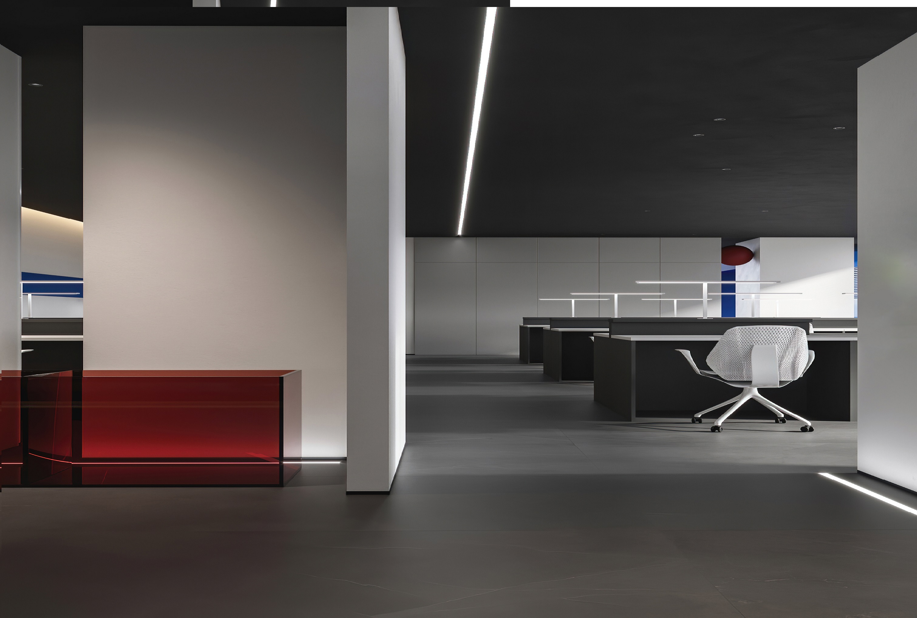案例說(shuō)明:本案圍繞其“靈透”,大量使用了玻璃、銀色系列及淺色調(diào)的潔凈材料,如玻璃幕墻、銀質(zhì)鋁塑板、水晶白麻石材、玻化磚等,圍繞本案主題,構(gòu)筑個(gè)性化空間,該色彩搭配除了清透、雅致、穩(wěn)重、大氣之外,亦表現(xiàn)出一種力度感和效率感。滲透入貴機(jī)械制造企業(yè)之“清透感”,亦反襯企業(yè)之“柔美感”。以似乎矛盾的手法,又體現(xiàn)出古人之哲理“剛之極則柔,柔之極則剛”。老子說(shuō)“上善若水”,該案則就其“善”滲透到每一個(gè)空間,極盡讓每個(gè)功能區(qū)都具有清透之靈性,盡顯靈動(dòng)、清澈、時(shí)尚、大氣之空間氣韻。