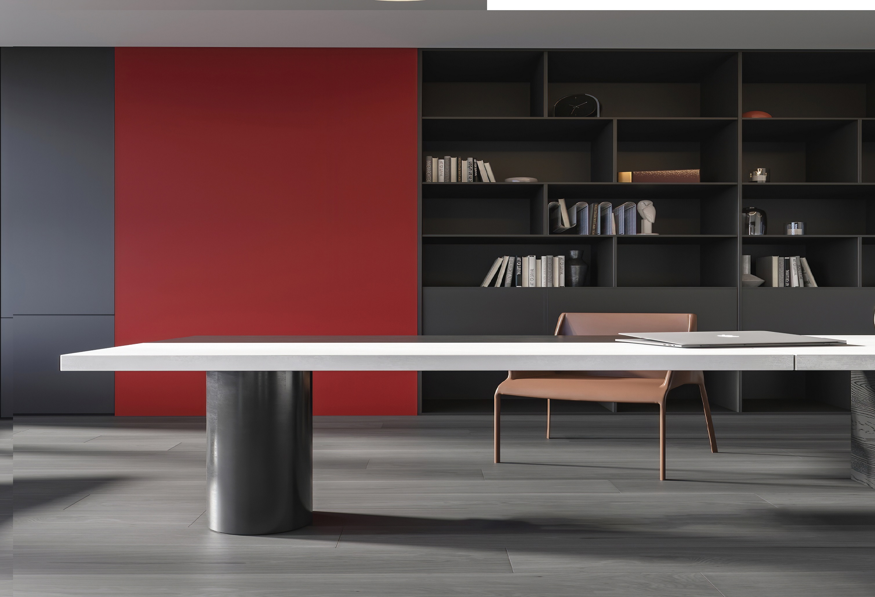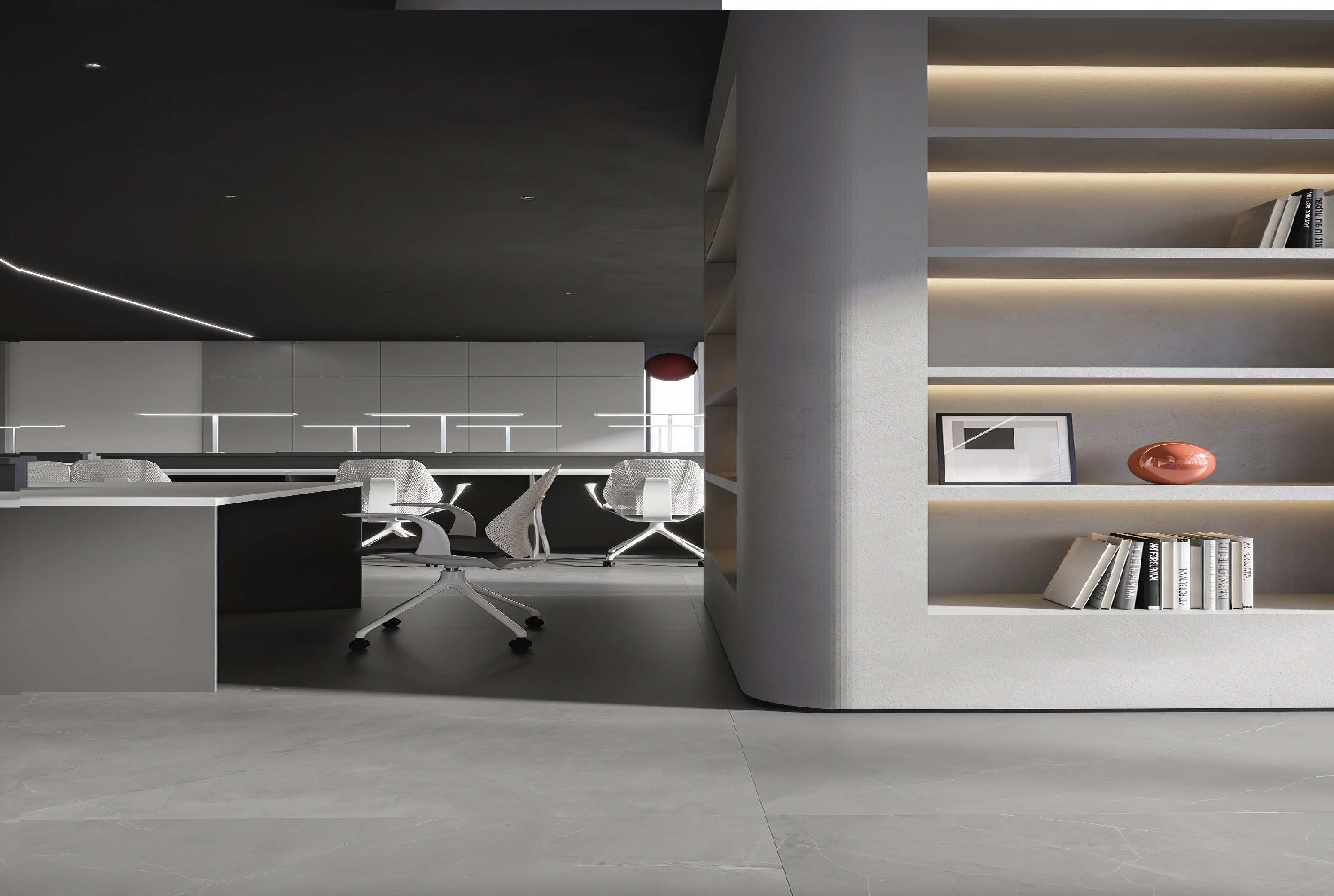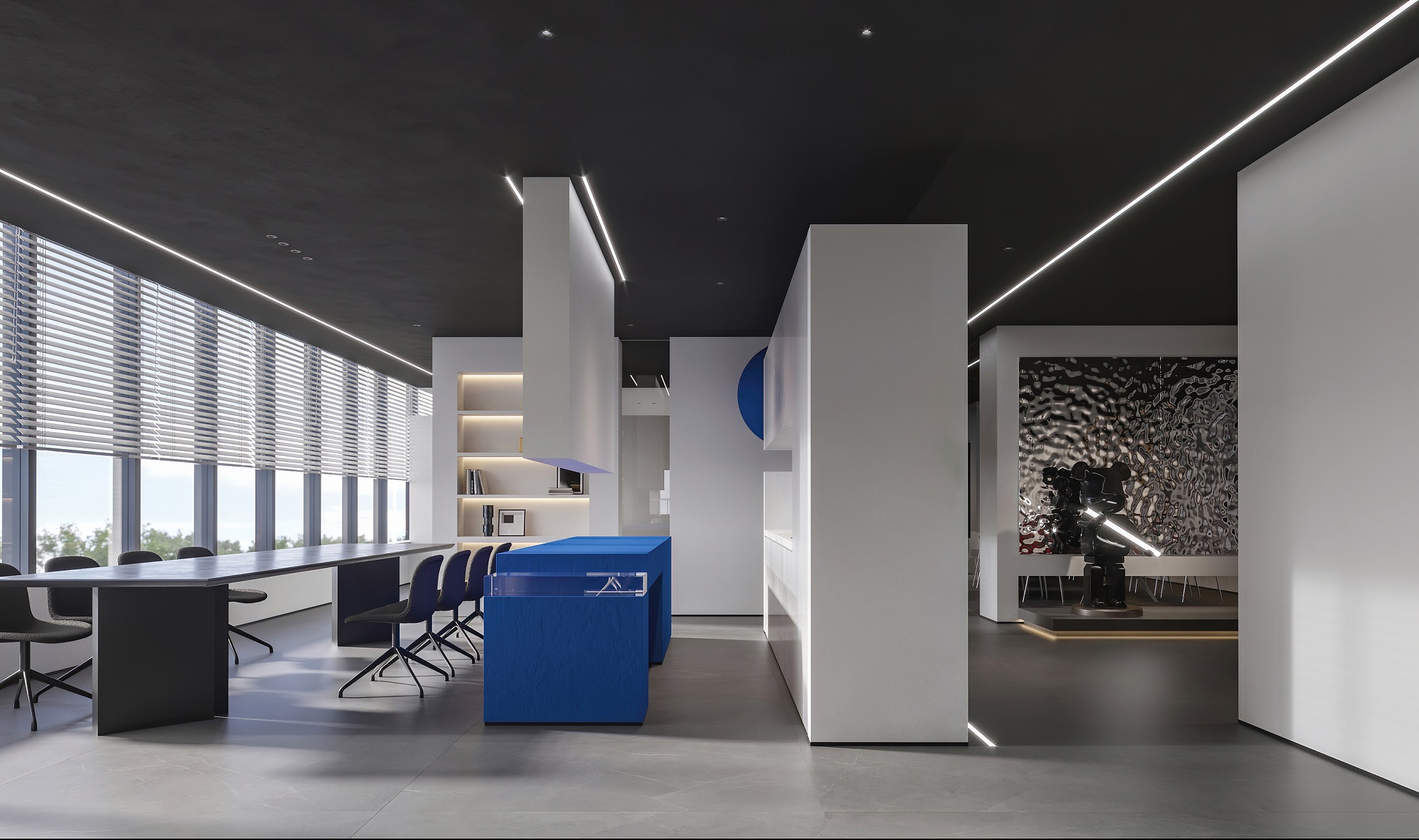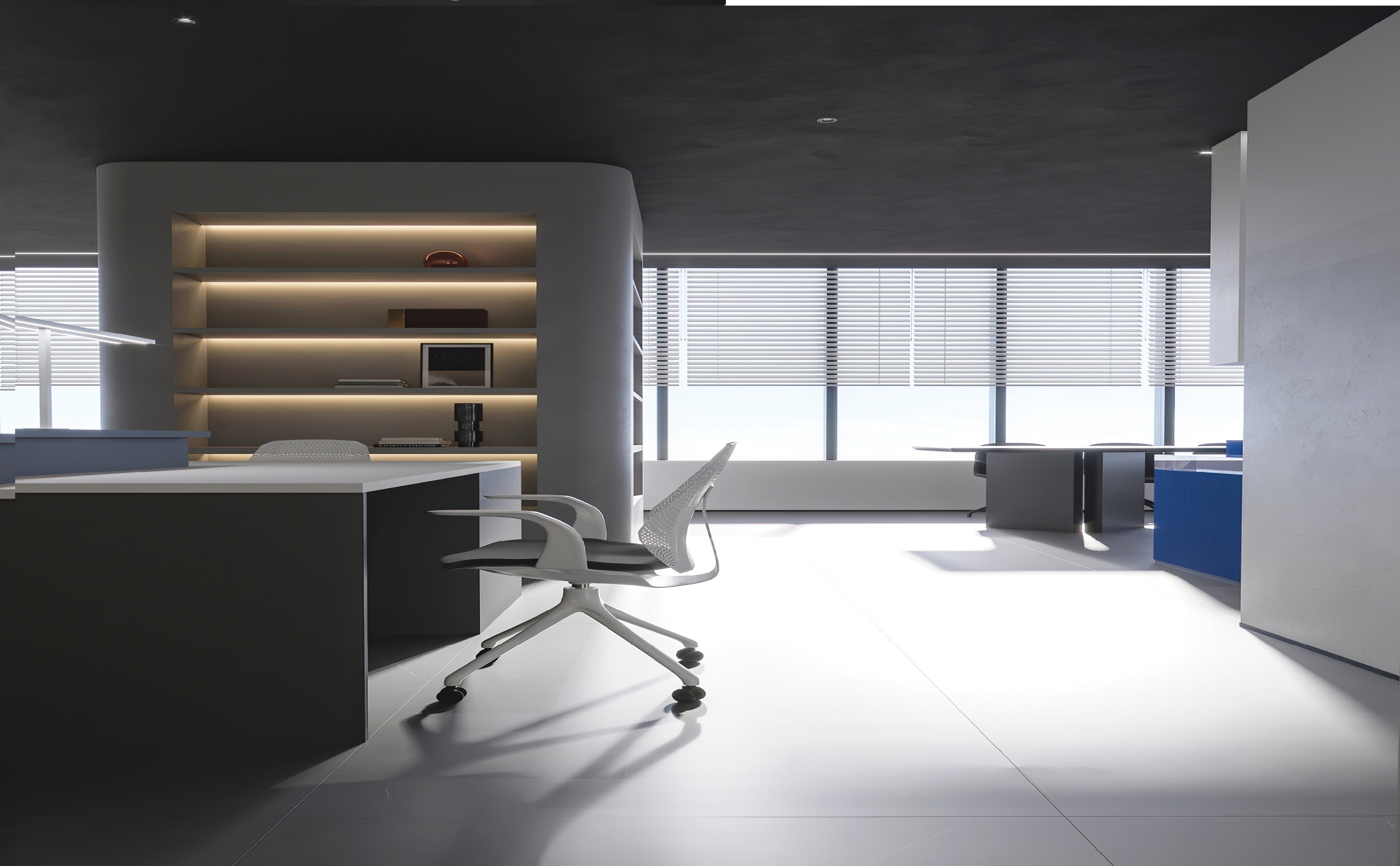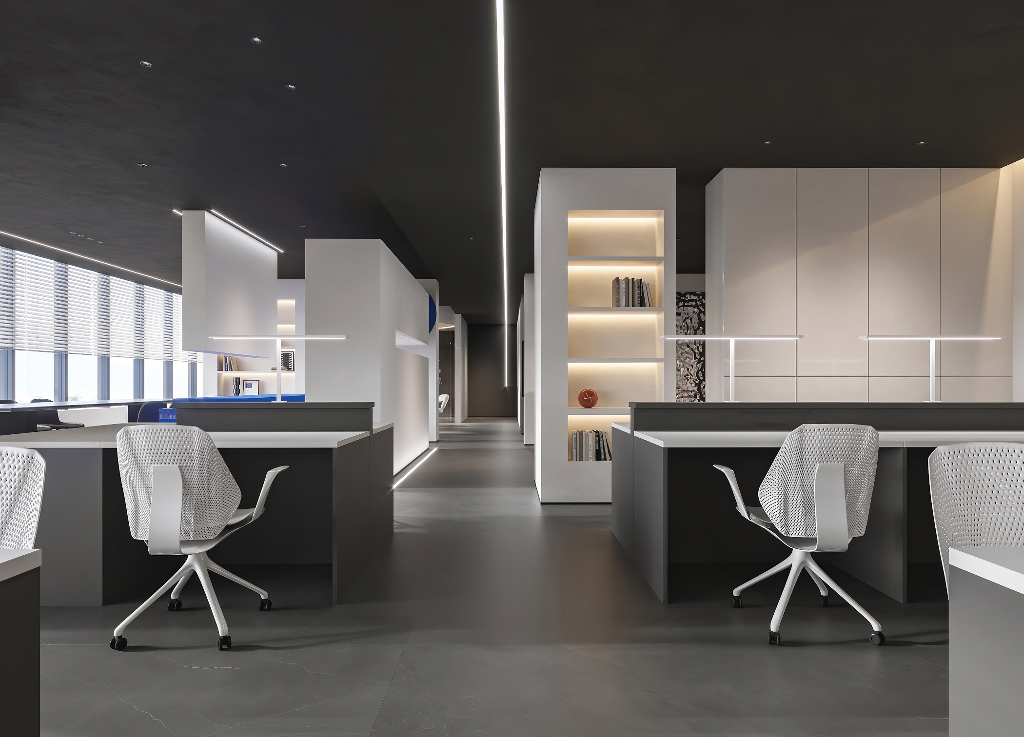 案例說(shuō)明:本案圍繞其“靈透”,大量使用了玻璃、銀色系列及淺色調(diào)的潔凈材料,如玻璃幕墻、銀質(zhì)鋁塑板、水晶白麻石材、玻化磚等,圍繞本案主題,構(gòu)筑個(gè)性化空間,該色彩搭配除了清透、雅致、穩(wěn)重、大氣之外,亦表現(xiàn)出一種力度感和效率感。滲透入貴機(jī)械制造企業(yè)之“清透感”,亦反襯企業(yè)之“柔美感”。以似乎矛盾的手法,又體現(xiàn)出古人之哲理“剛之極則柔,柔之極則剛”。老子說(shuō)“上善若水”,該案則就其“善”滲透到每一個(gè)空間,極盡讓每個(gè)功能區(qū)都具有清透之靈性,盡顯靈動(dòng)、清澈、時(shí)尚、大氣之空間氣韻。