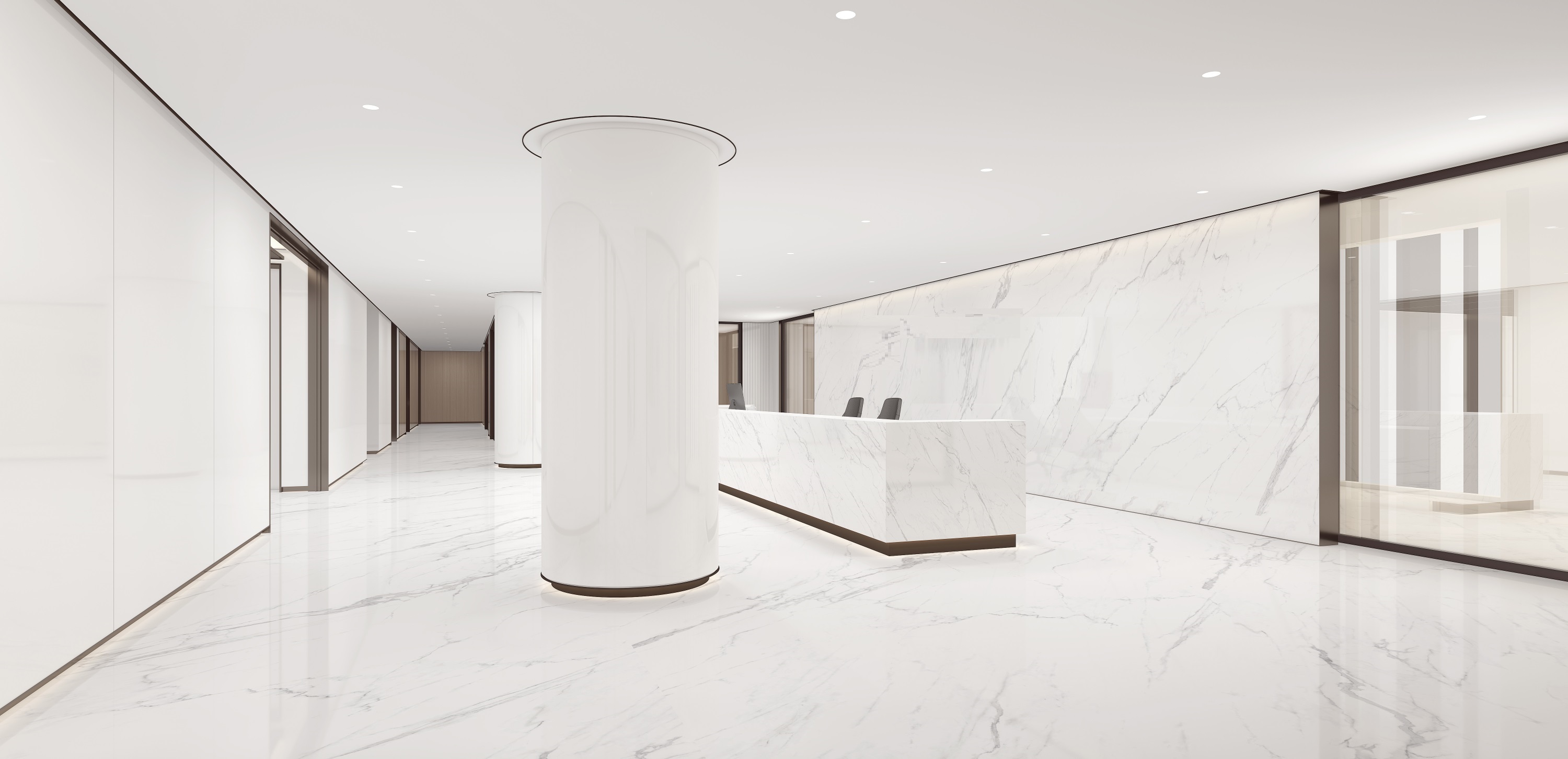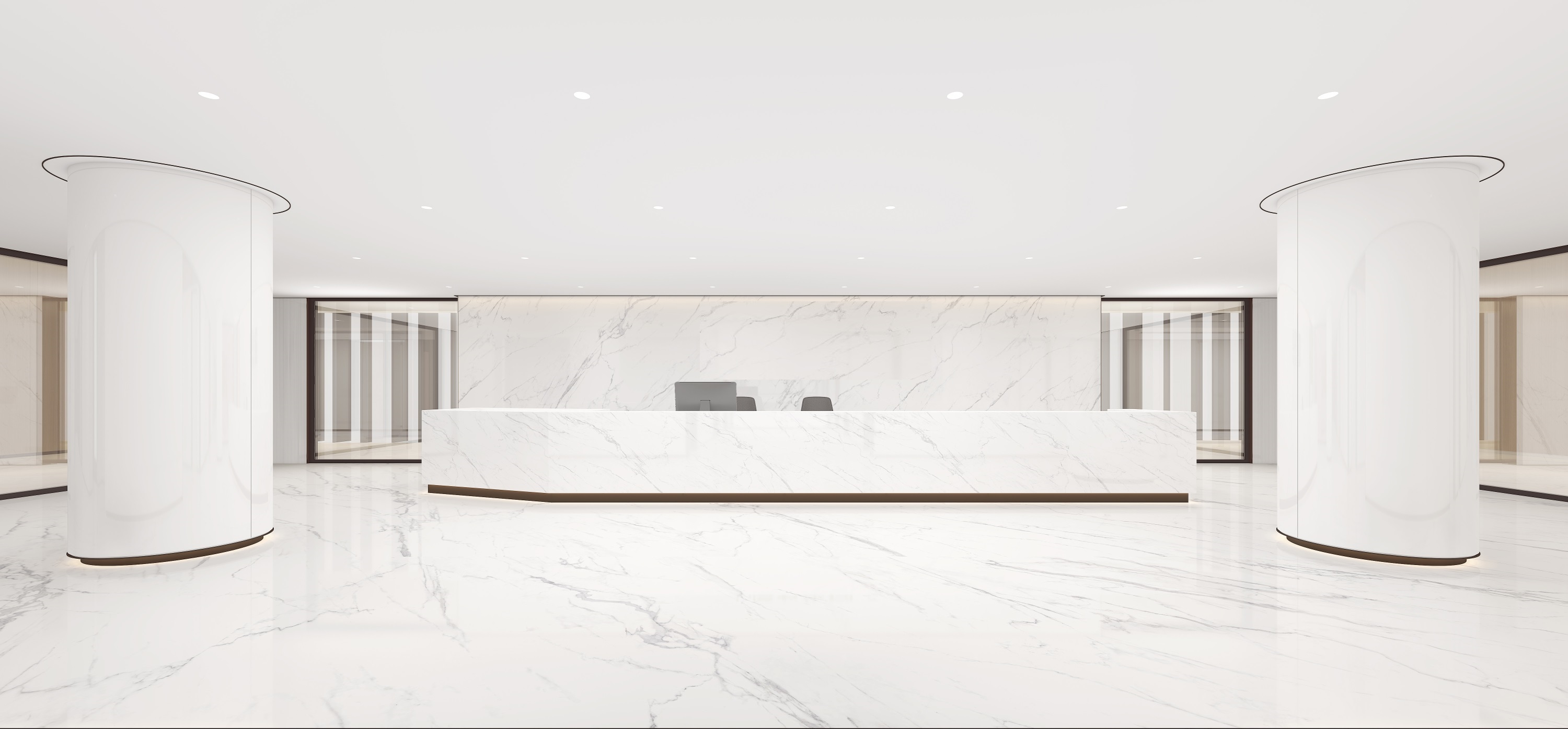 案例說明:本案設計中企業形象墻,以其企業文化的新興、蓬勃、嚴謹為主題,兩側以居有竹、步步高的銀色墻柱帶來視覺沖擊感,加上企業形象色的類比色、淺色石材及不銹鋼條的運用,顯示出金屬的質感和工業文明的主題;然而休息區的陳設卻明麗蔥郁,充滿人文情感的自然氣息,恰恰彌補了視覺中的剛硬個冷竣,使人倍感親切。