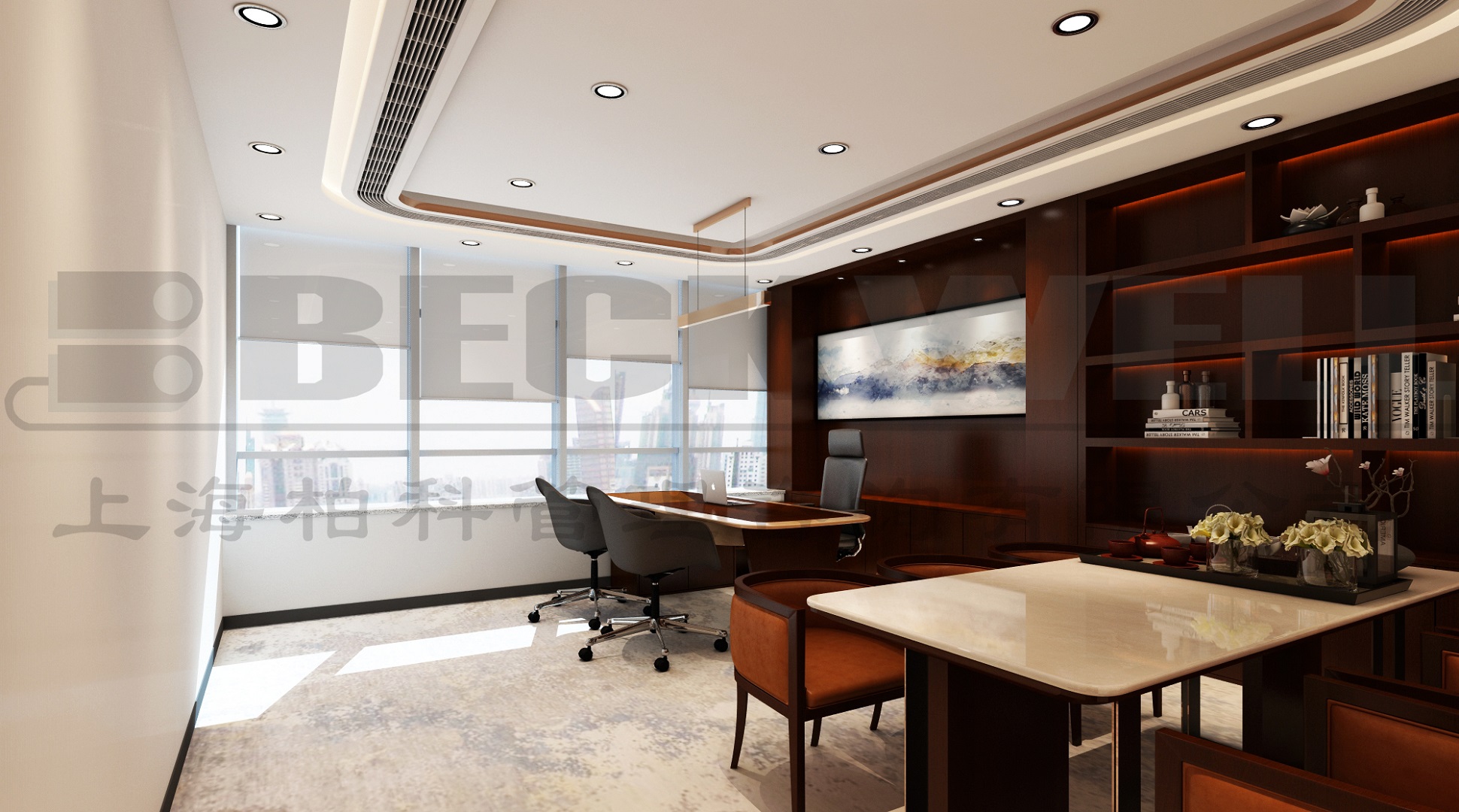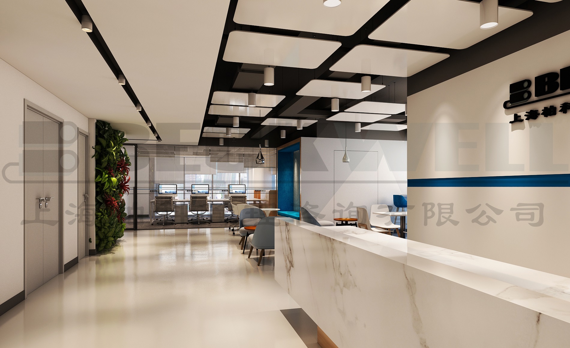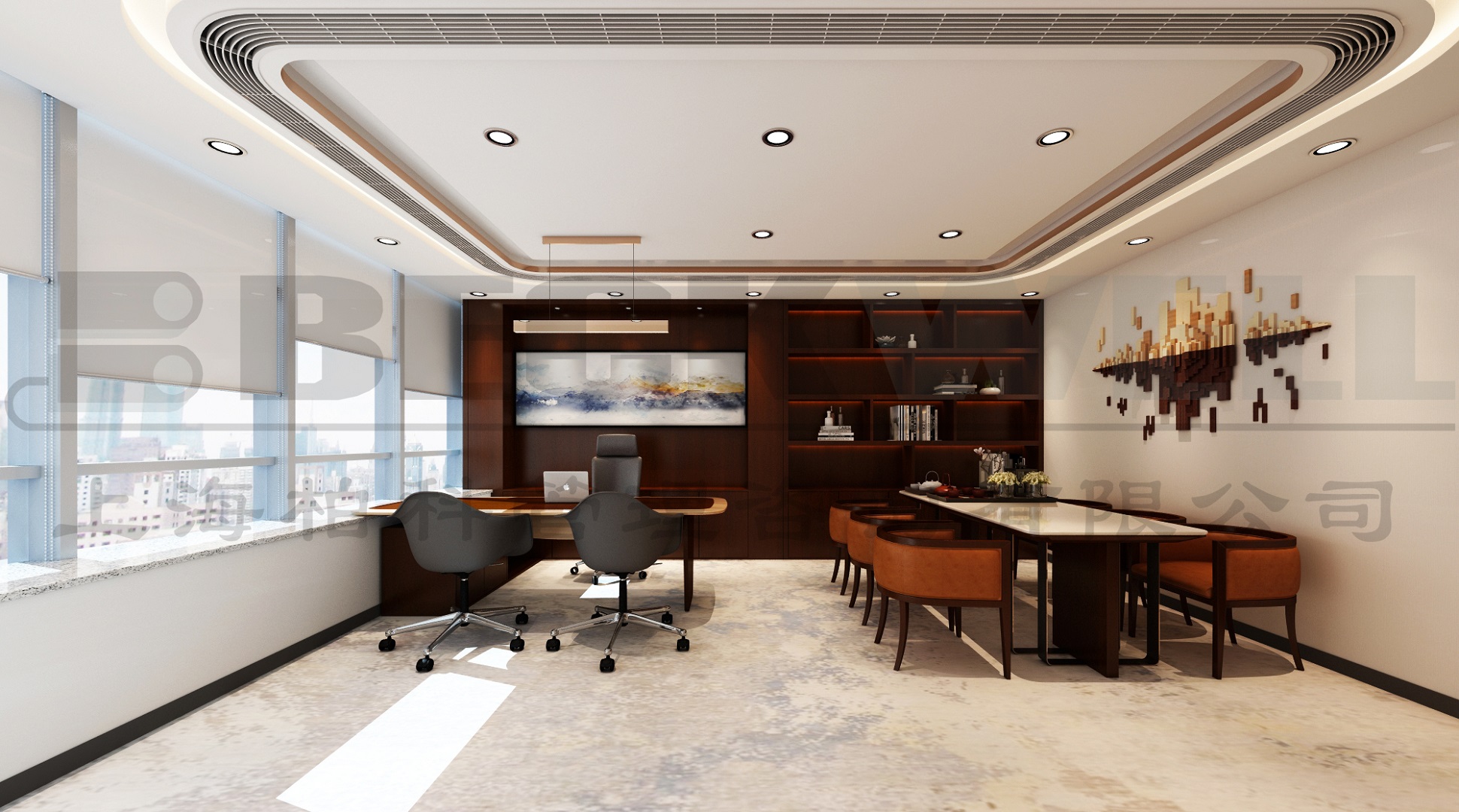 案例說明: 本案為上海管理咨詢公司自購整層辦公樓裝修項目,裝修面積2800平方,該項目強調空間的整體性,風格的統一性。根據不同功能對相應的房間立面作出處理方案,提倡自然簡潔和理性的規則,比例均勻、形勢新奇、材料搭配合理、收口方式干凈利落、維護省事。整個內部結構嚴密緊湊、空間穿插有序、圍護體各界面要素的虛實構成要比較明顯,經過虛實互換的空間形象,取得局部和整個空間的和諧。強調空間的完整性和高貴、典雅感。